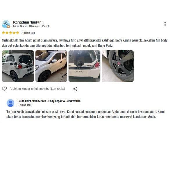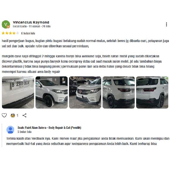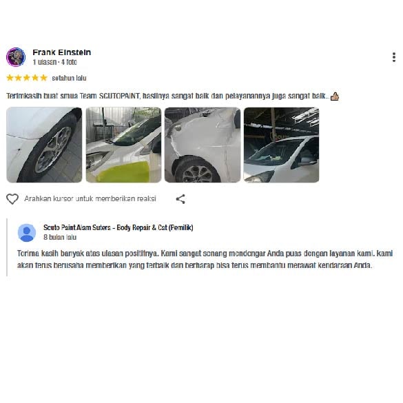 Terima kasih scuto alsut sdh bantu kembalikan mobil sy seperti smula. Baret penyok kmrin habis nabrak pinggiran trotoar sekarang udah mulus lagi mobilnya.